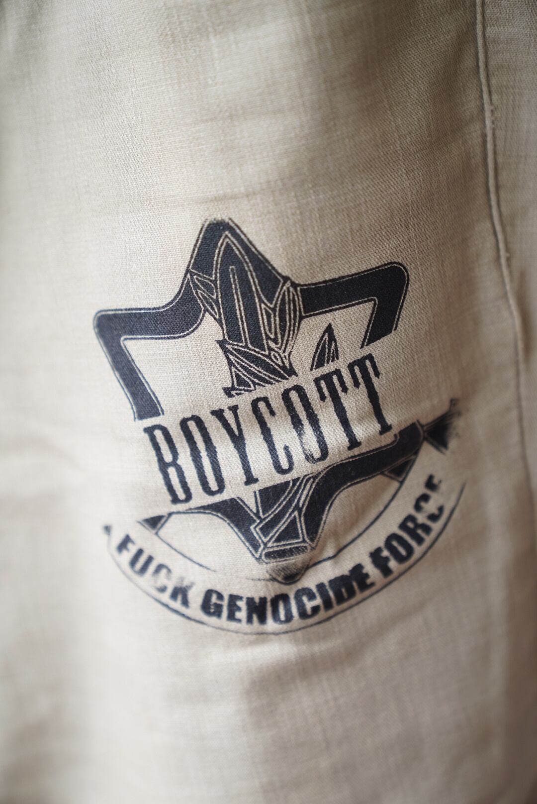 DANNY JINの代表曲「BOYCOTT」で用いられた、血塗りのイスラエル軍エムブレムを再現したデザイン。